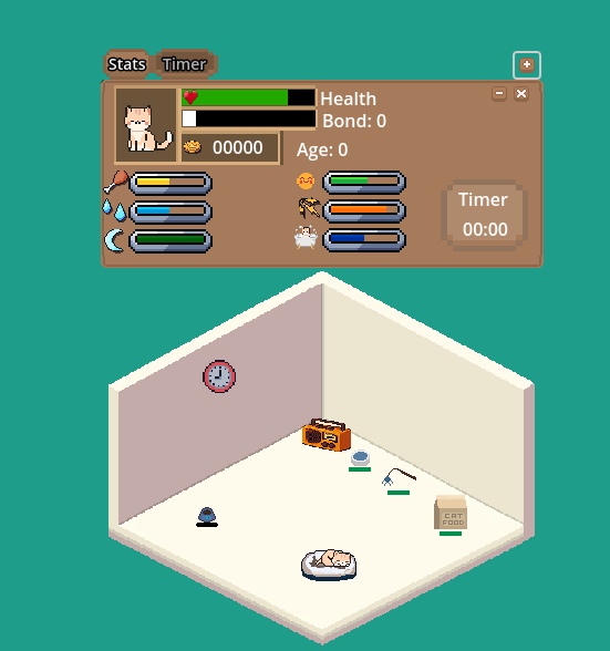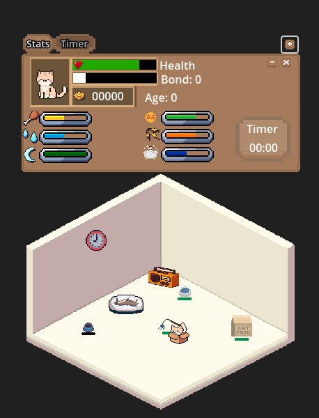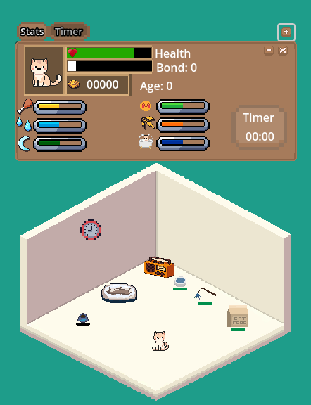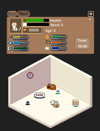 A cozy virtual pet game where you can feed, give water, play, and let your pet sleep. The game features relaxing background music and simple Pomodoro-style timing. It’s still in development, but you can already interact and care for your little friend!